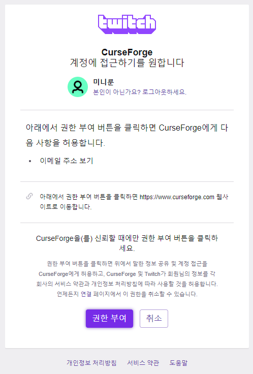 아직 까지 curseforge는 twitch 아이디와 아주 잘 연동됩니다.